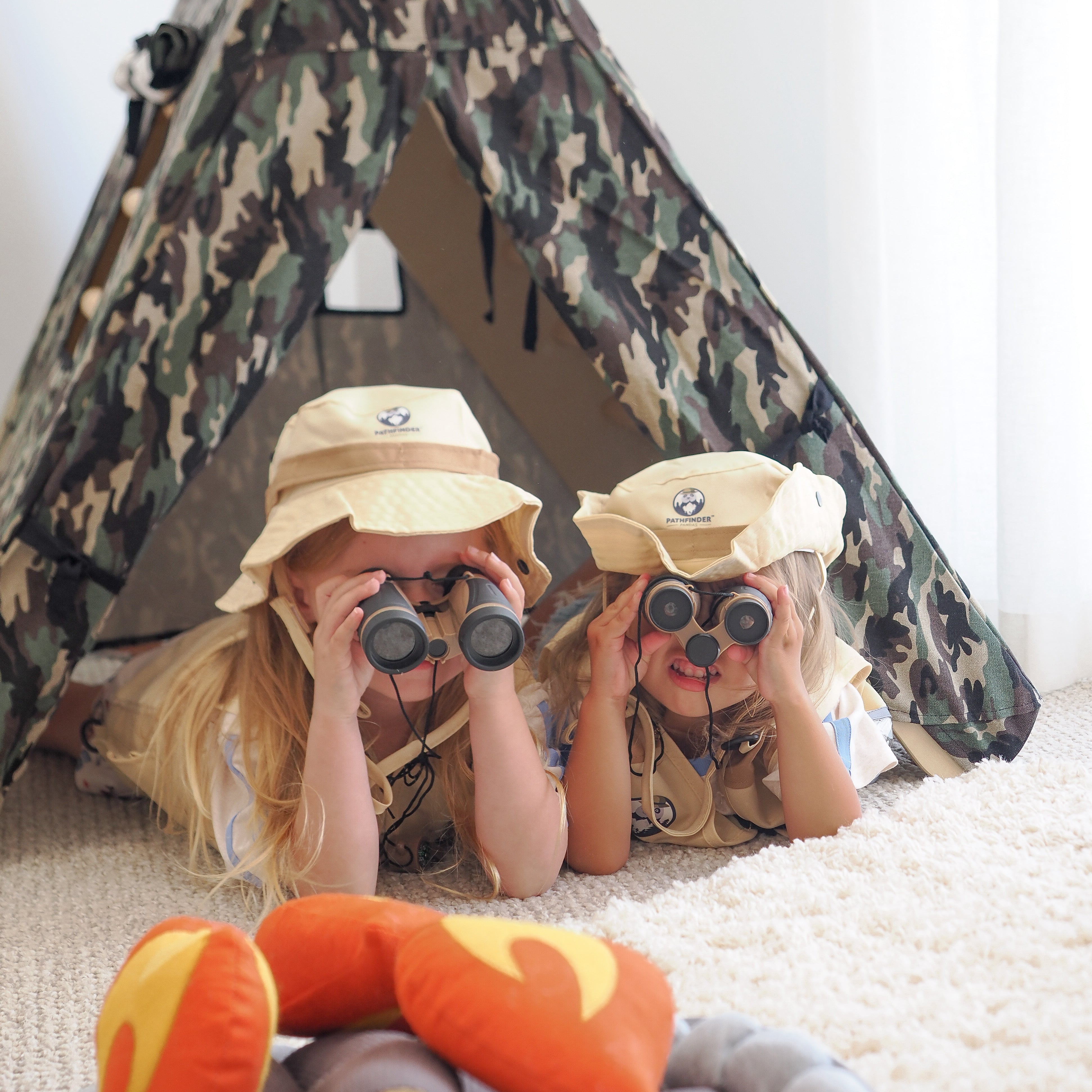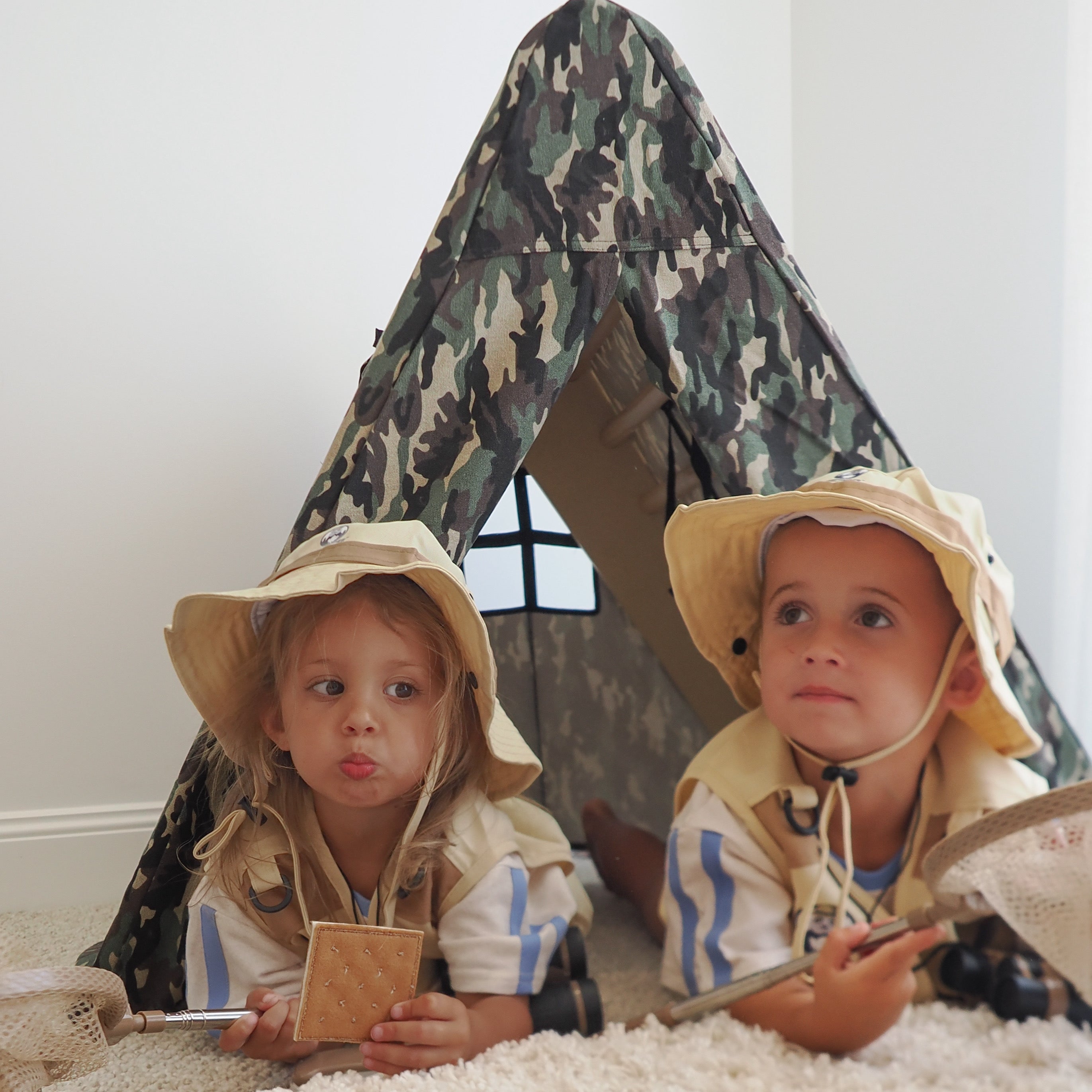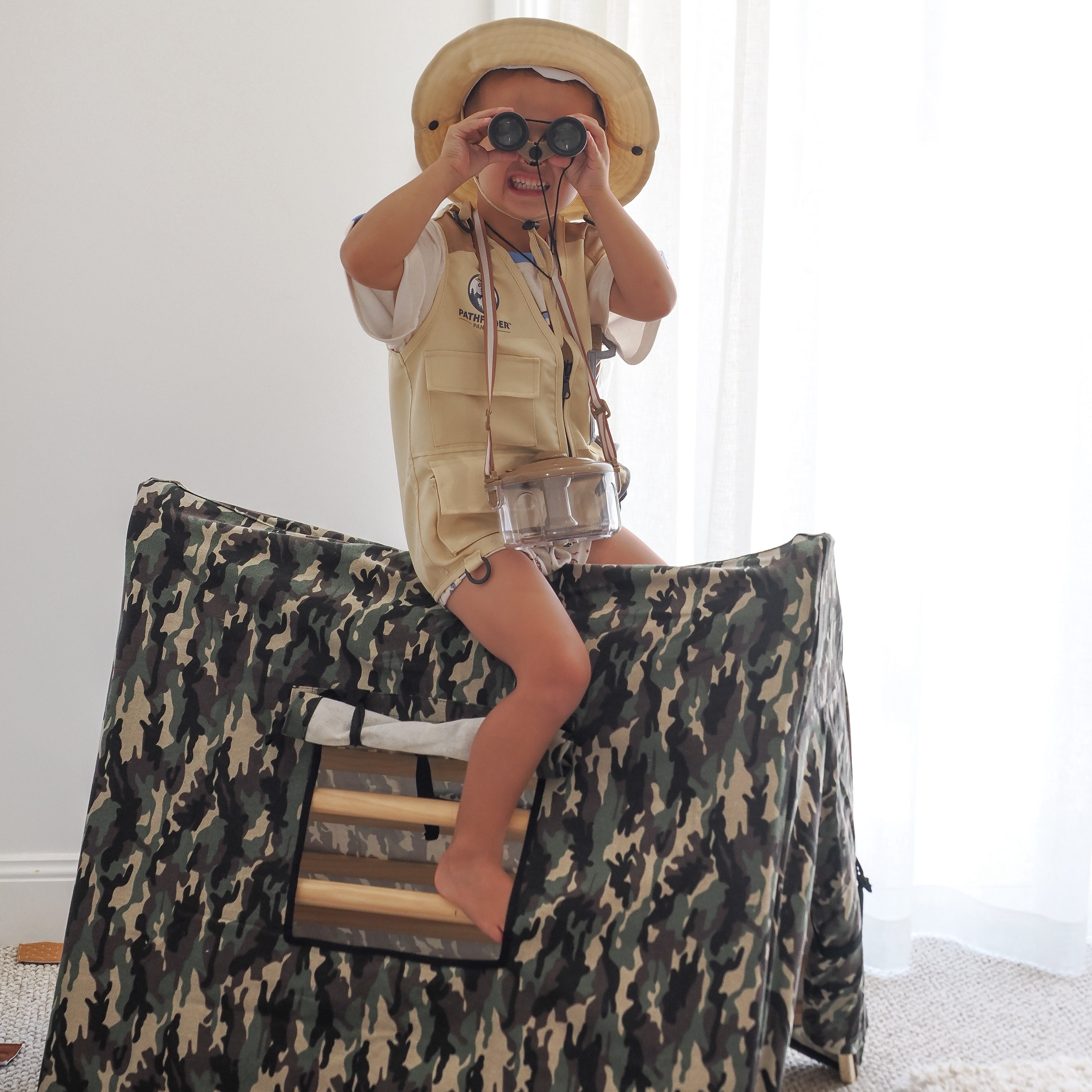 Add a playful touch to your climbing frame with this classic camouflaged tent cover. Designed to spark imagination, it transforms your Pikler into the perfect hideaway for little adventurers. Each tent cover includes a matching canvas storage bag, two side windows, a front door with curtains that can be tied back, and a back window for extra peek-a-boo fun. Made from soft, durable cotton, it’s easy to attach and remove—perfect for hours of open-ended play and stylish enough to complement any play space.