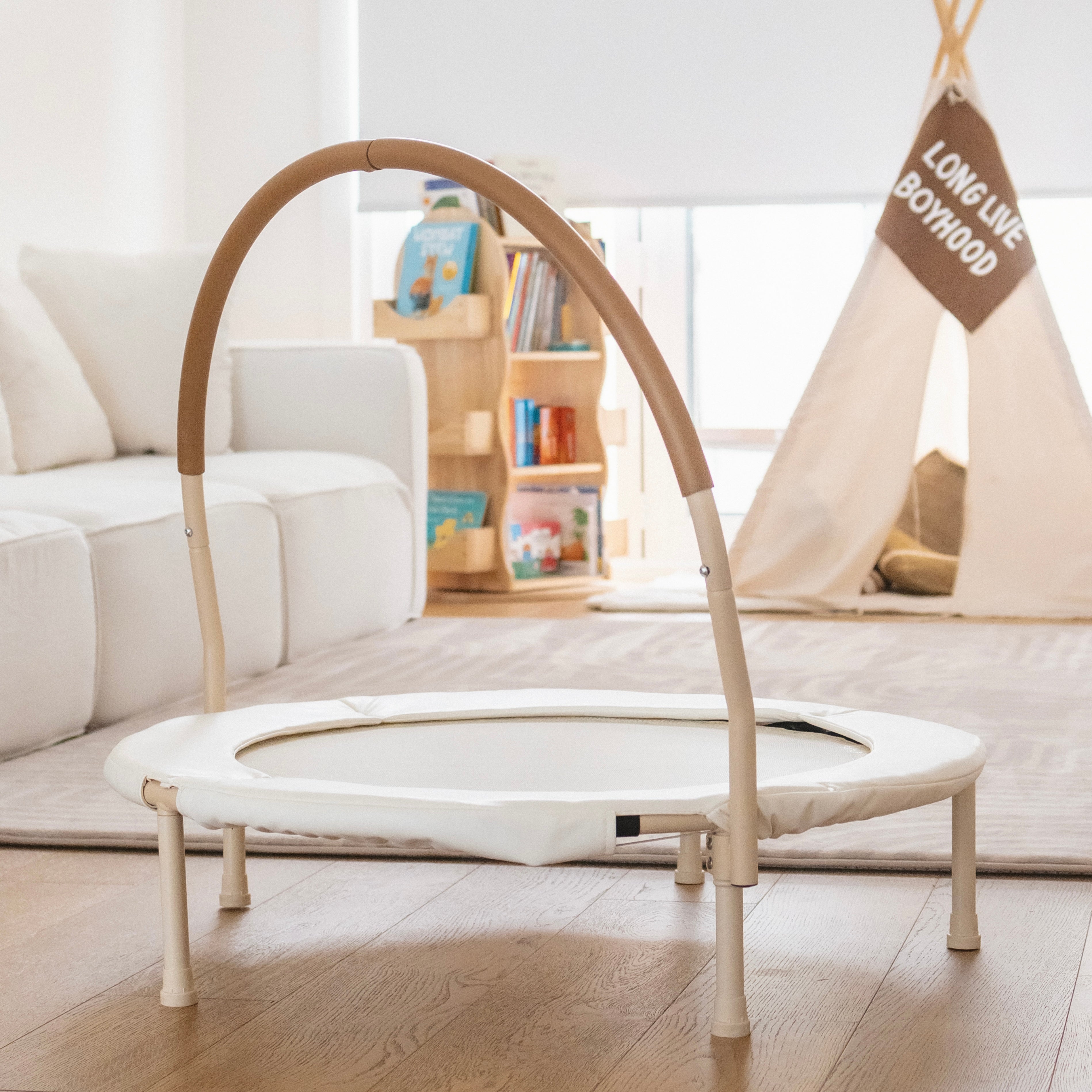 Its low-profile frame and softly padded edge make it easy for toddlers and young children to step on and off independently, while the supportive mesh jumping surface provides gentle rebound without overwhelming bounce. The integrated curved handle offers added stability for early jumpers, helping build confidence as skills develop.